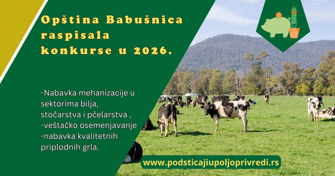Opština Babušnica raspisala je seriju konkursa namenjenih razvoju poljoprivrede. Konkursi obuhvataju nabavku mehanizacije u sektorima bilja, stočarstva i pčelarstva , veštačko osemenjavanje i nabavka kvalitetnih priplodnih grla.